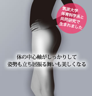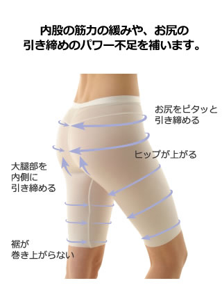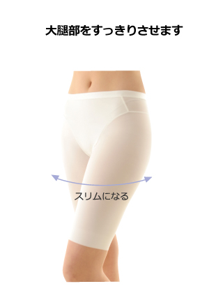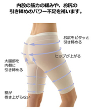 粘りのある生地を使い、そけい部の圧迫を避け、お尻と大腿部の引き締めをすることにより履くと体が軽くなります。